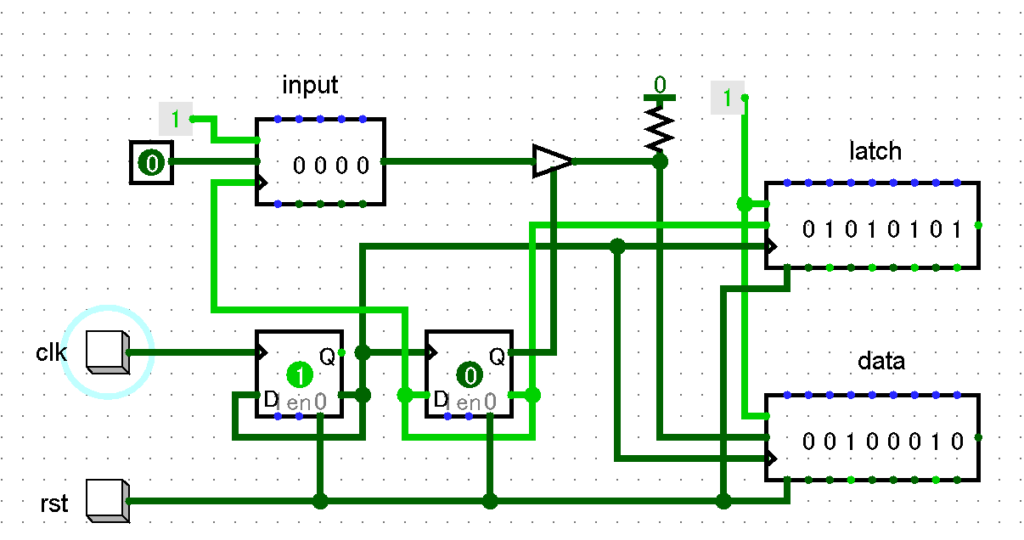 こんな感じの回路を組んでみた inputのシフトレジスタに入力されているのが保存したいデータ列