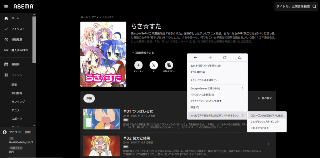 ただ、作品ページをひらいてそのまま実行すると見切れているページの下の方の話が読み込まれていないので、1クール24話なのに20話くらいまでしかリストに追加されないみたいなことが起きます。