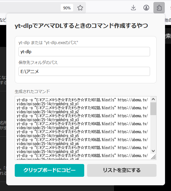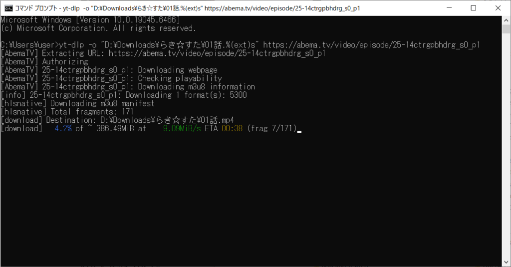 なので、 D:\Downloads\らき☆すた\01話.mp4 みたいに保存したいとき、先ほどの URL であればyt-dlp -o "D:\Downloads\らき☆すた\01話.%(ext)s" https://abema.tv/video/episode/25-14ctrgpbhdrg_s0_p1