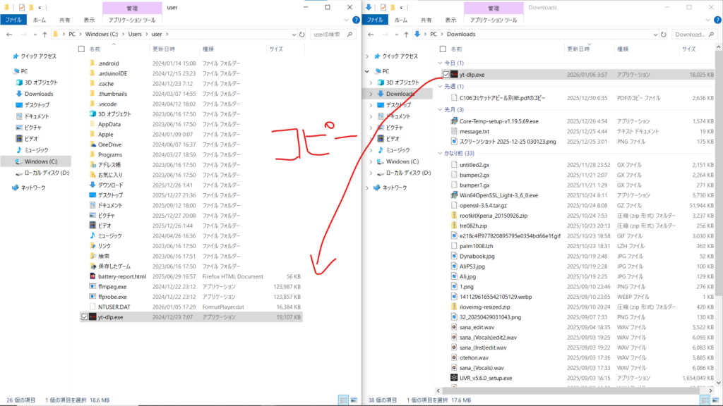 yt-dlp.exe をユーザーフォルダにいれる