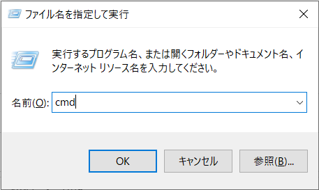 Win+R で ファイル名を指定して実行 を開き、 cmd と入力して OK を押しましょう。